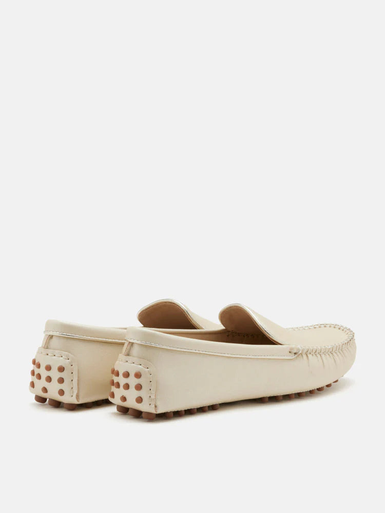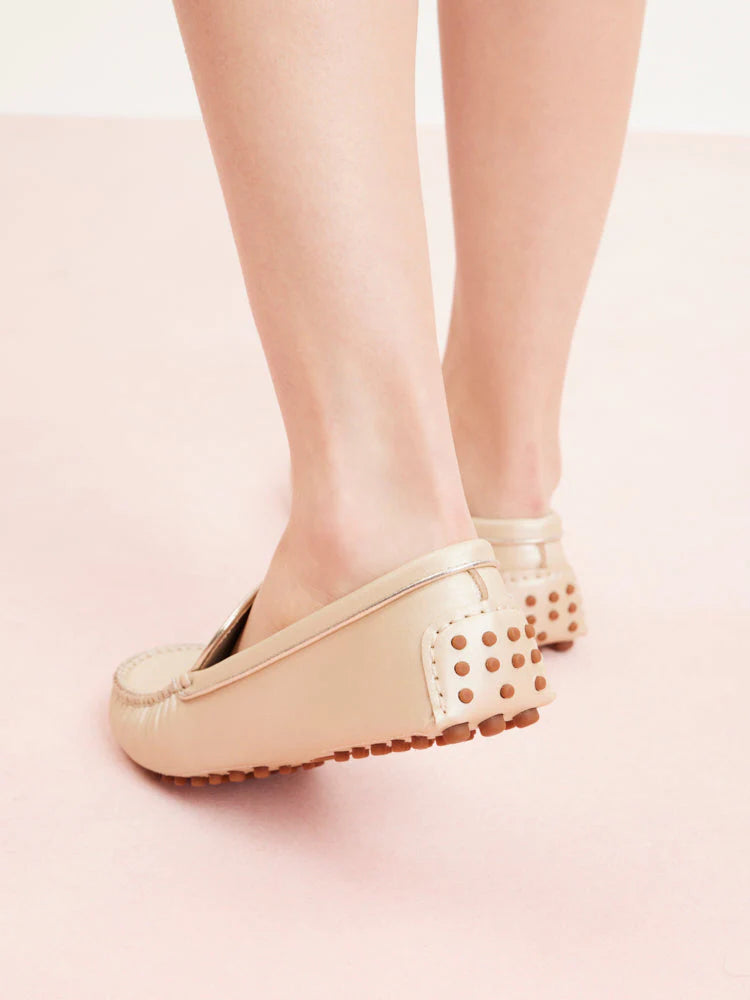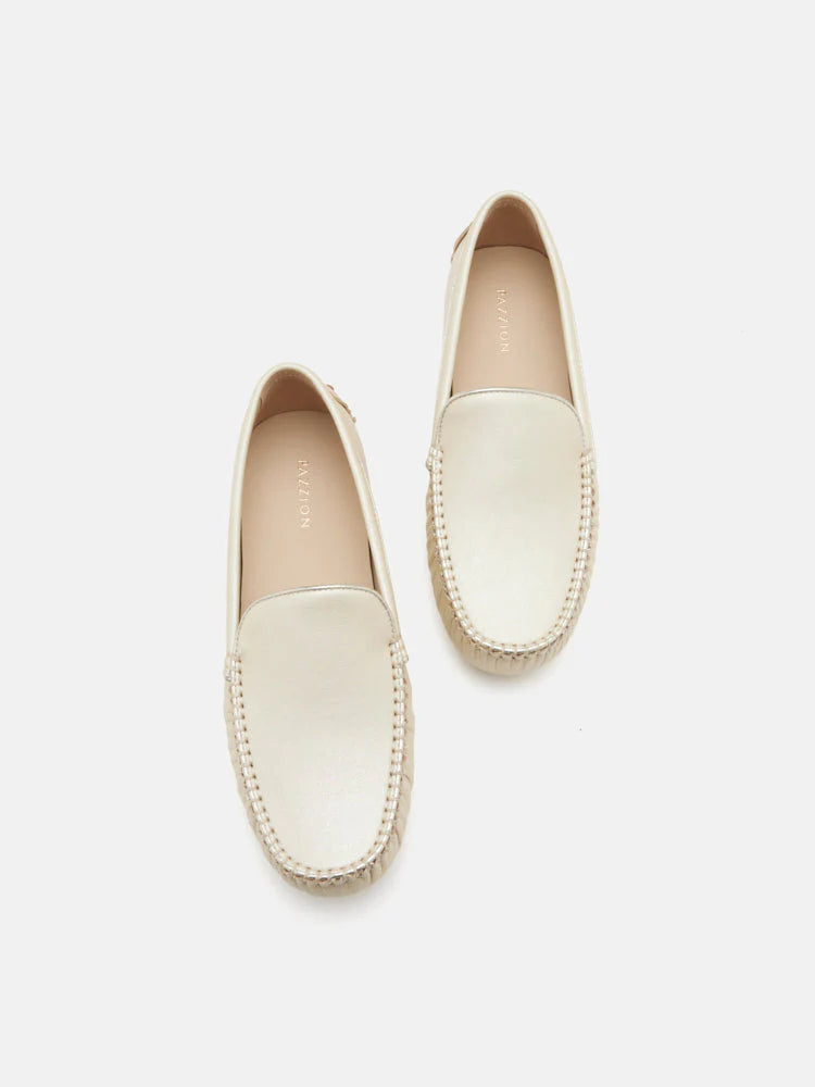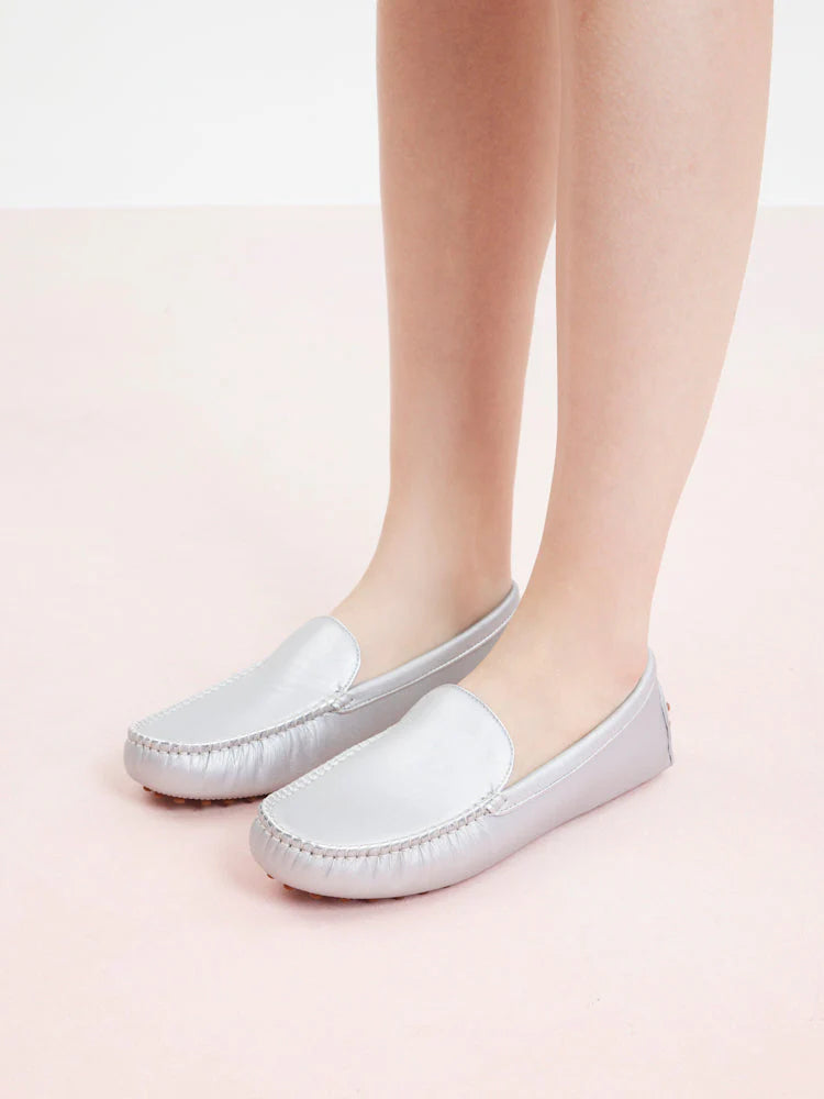 這款金屬色莫卡辛鞋巧妙地將現代精緻與實用設計結合。鞋底柔軟且具彈性,提供極致的舒適感,同時散發出低調而華麗的光澤。這是對永恆經典的現代詮釋,低調卻引人注目,適合每一刻的完美選擇。